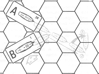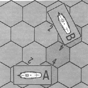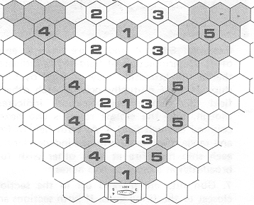 The 22" by 28" mapboard is the playing surface upon which the ships are maneuvered. The hexagonal grid printed on the mapboard is used to determine movement, firing ranges, and the positions of the ships. Each hex (hexagon) has an identification code, this being used to determine the initial placement of ships for the various scenarios. The code is also valuable in checking a ship’s movement. Portions of the board are sometimes used as juttings of land in certain scenarios, and will be defined as such in the applicable scenario. A wind direction hexagon is found at the lower lefthand corner. Each edge of the board is labeled by the wind direction numbers pointing toward it. The four edges are labeled in clockwise order, 1, 2–3, 4, 5–6.